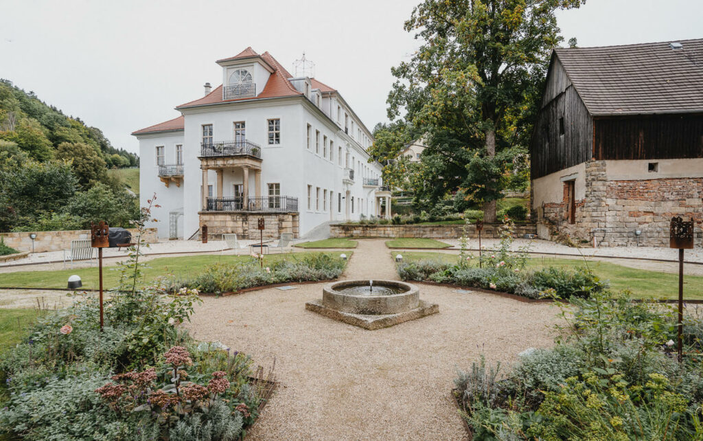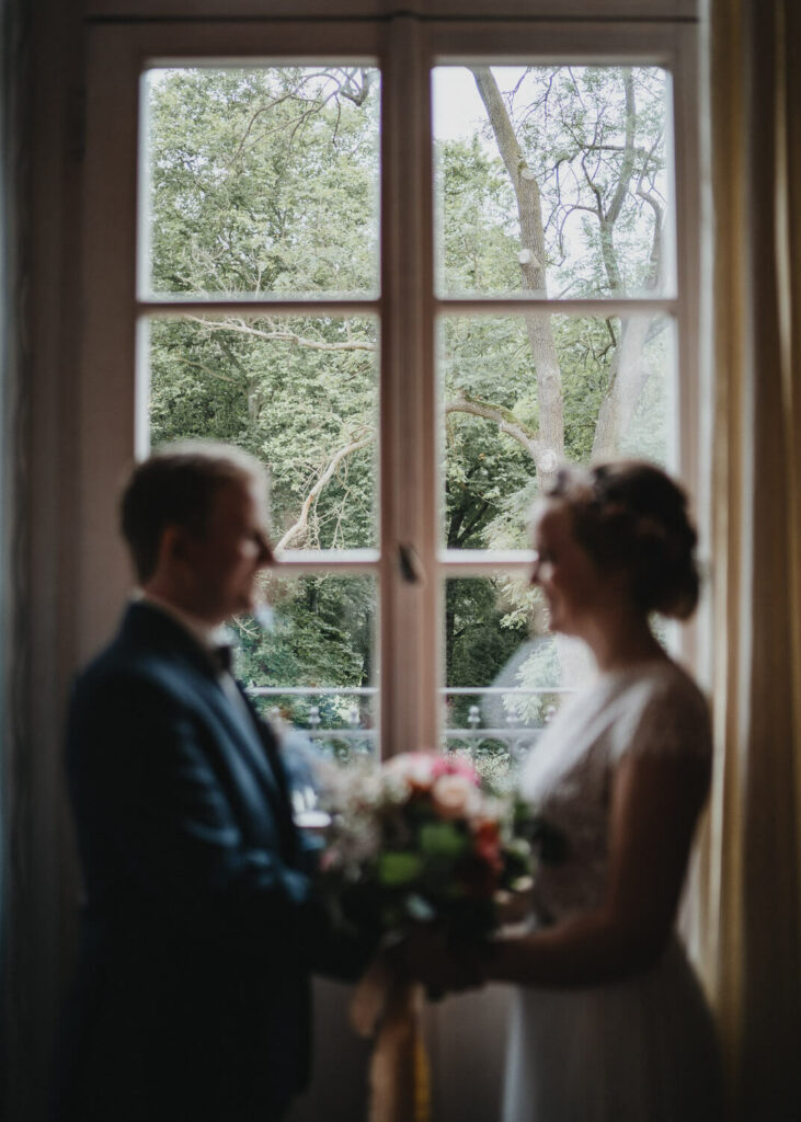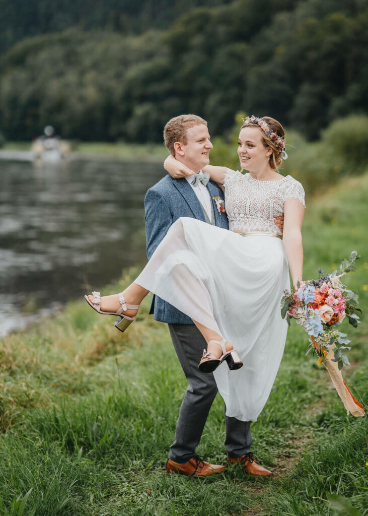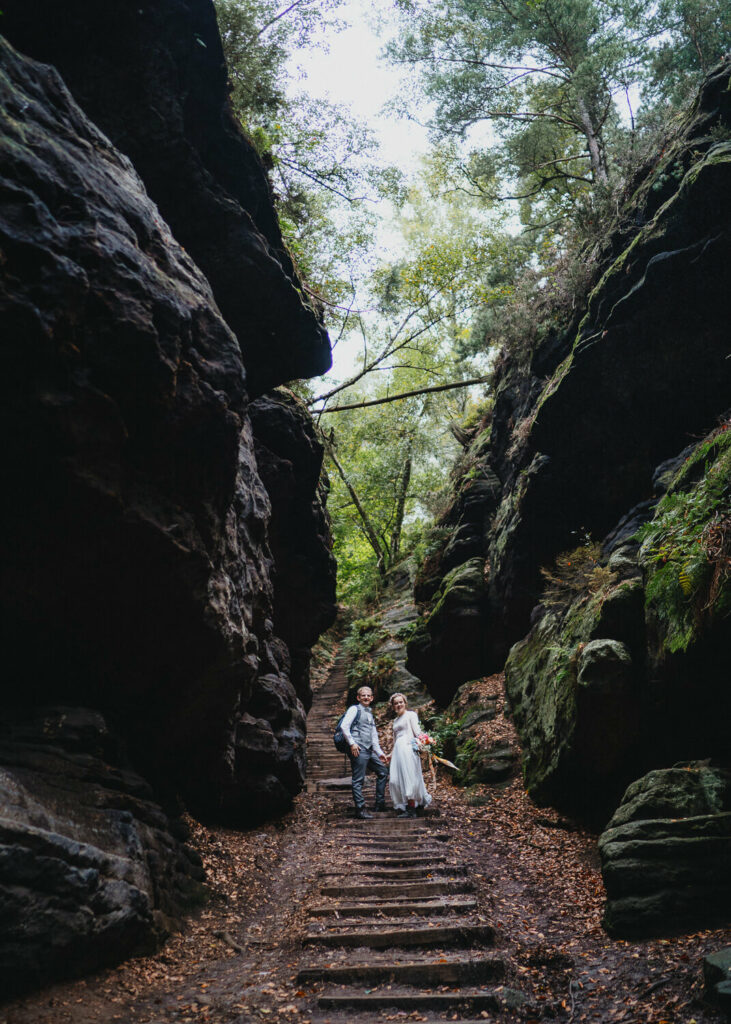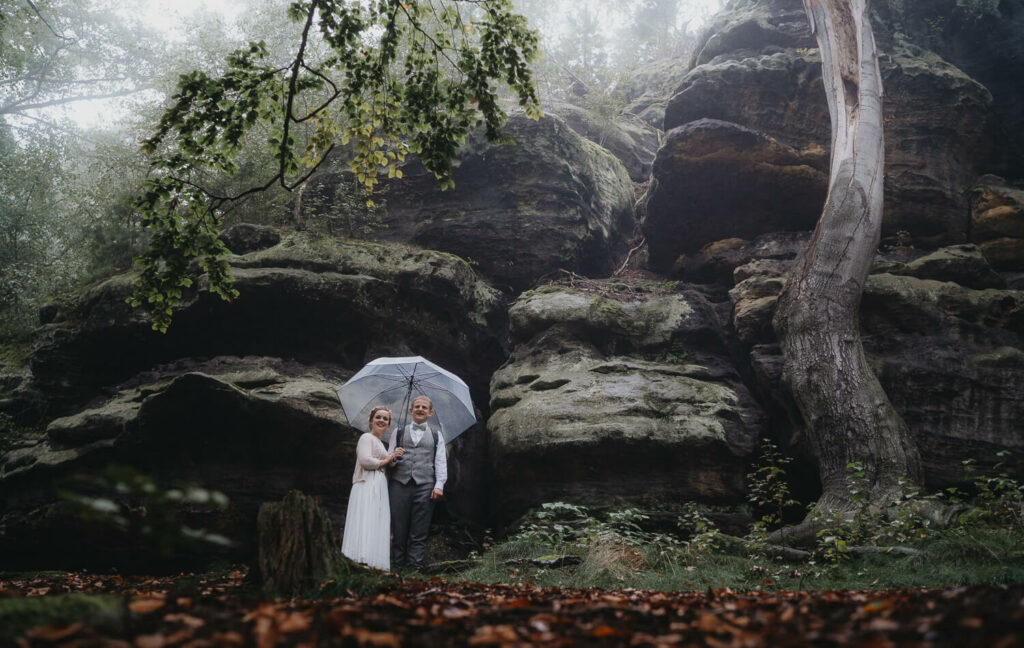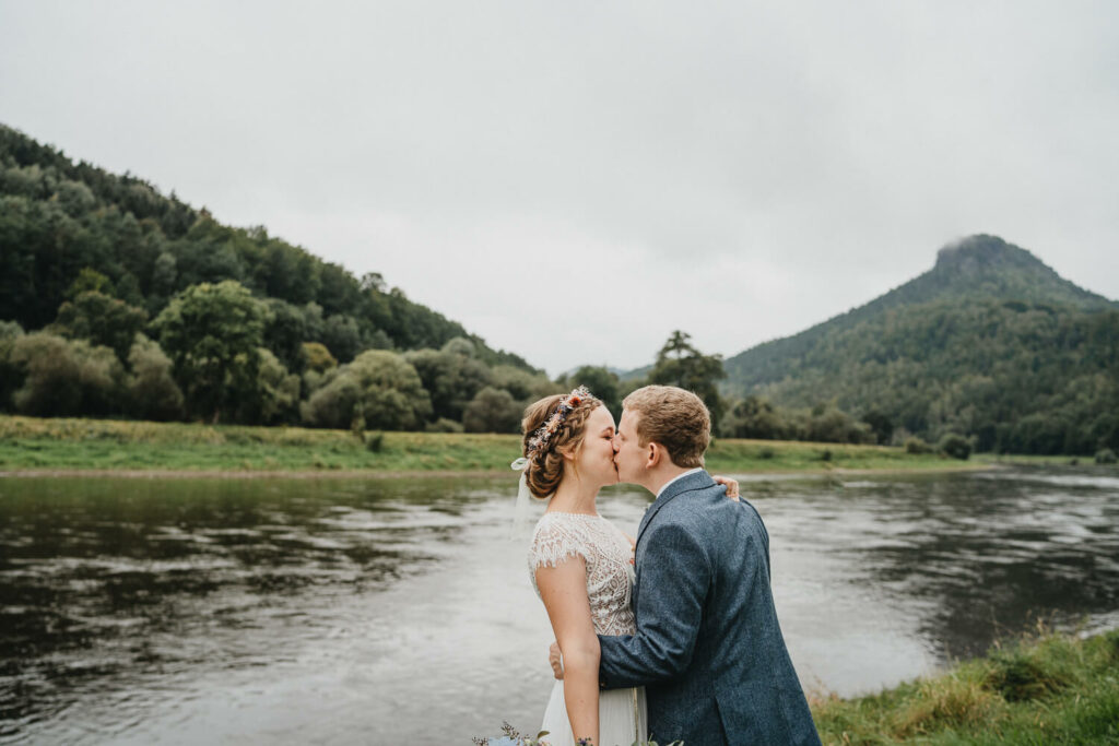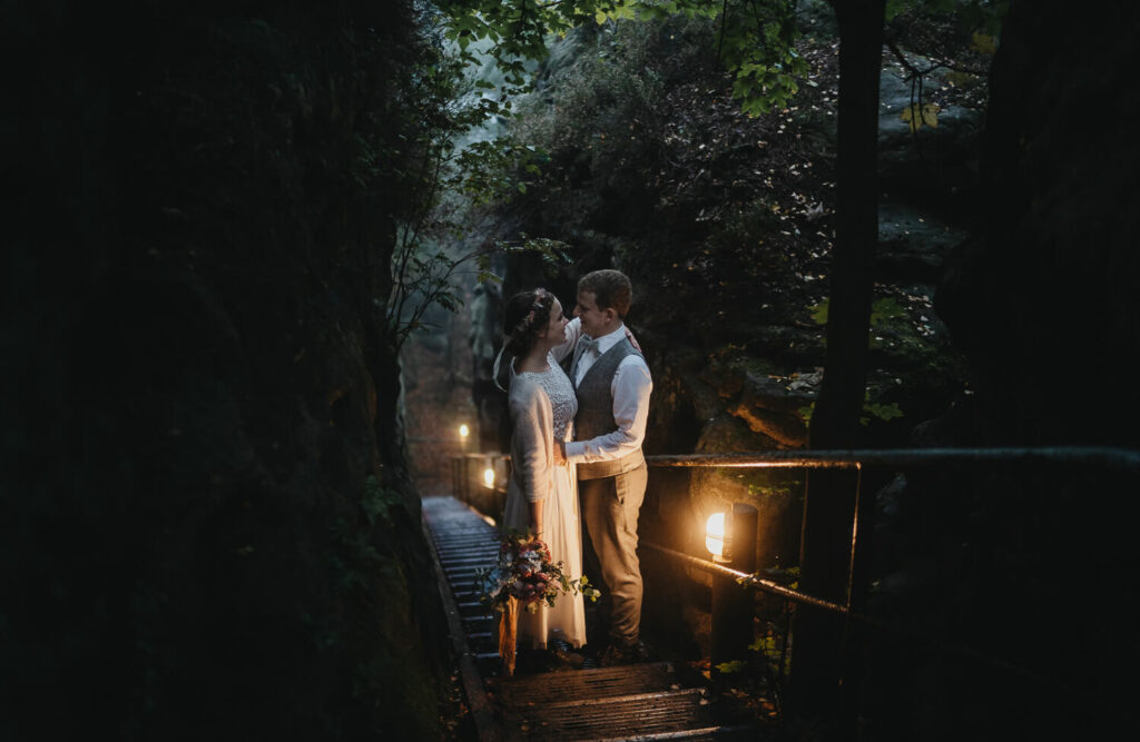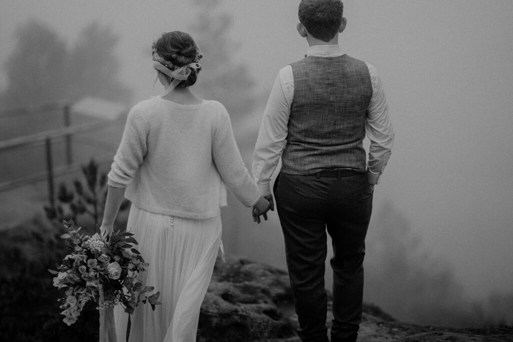 Im wunderschön gelegenen Schloßgarten auf Schloß Prossen haben sich die beiden sich das „Ja-Wort“ gegeben – mit all ihren Liebsten. Es war eine so emotionale und schöne Trauung mit unglaublich schönem Live-Gesang. Und das Beste, die beiden haben ihre Trauung auf den Nachmittag gelegt. Ich glaube, es ist kaum ein Auge trocken geblieben bei den lieben Worten, die von der Schwester der Braut vorgetragen wurden. Nach einem super leckeren Kaffeetrinken, den emotionalen Reden und der mega selbstgebackenen Hochzeitstorte ging dann die Reise los. Bei immer stärker werdenden Nebel des Elbsandsteingebirges ging es auf eine kleine super schön gelegenen Hütte auf den Papstsein, wo sich normalerweise ein herrlicher Blick auf die gesamte sächsische Schweiz auftut.