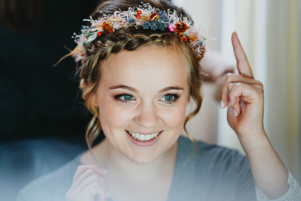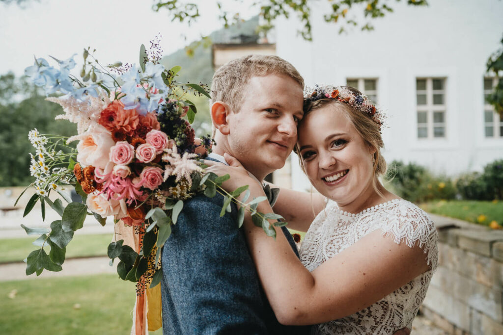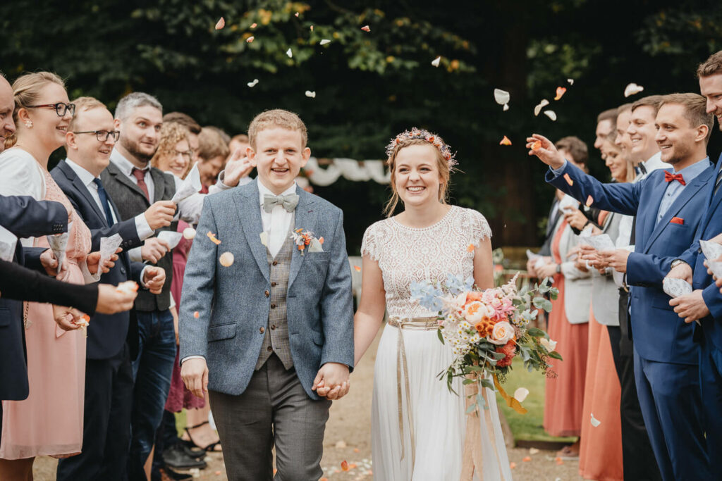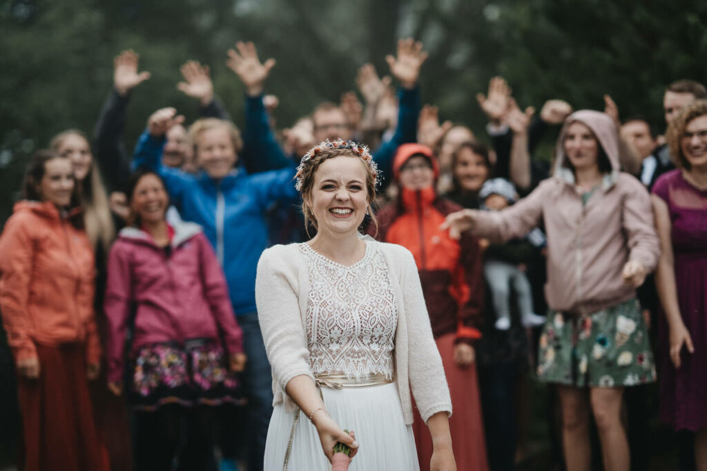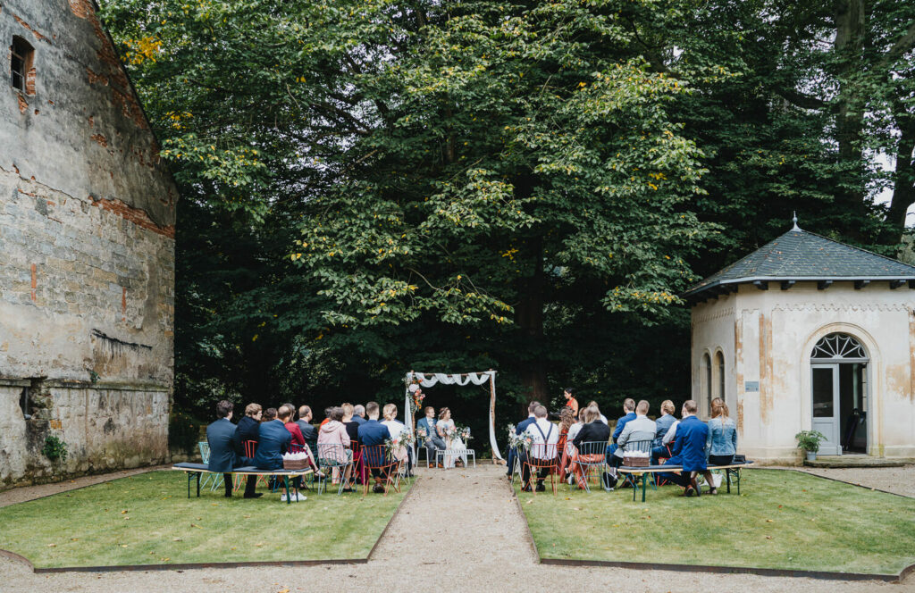 Die beiden haben die Trauung auf Nachmittag gelegt, was so viele Vorteile hat. Die Gäste können ganz in Ruhe anreisen, das Brautpaar hat morgens entspannt Zeit und der Tag ist nicht zu lang. – So bleibt mehr Energie für die Party am Abend und da haben die beiden denke nicht zu viel versprochen.
